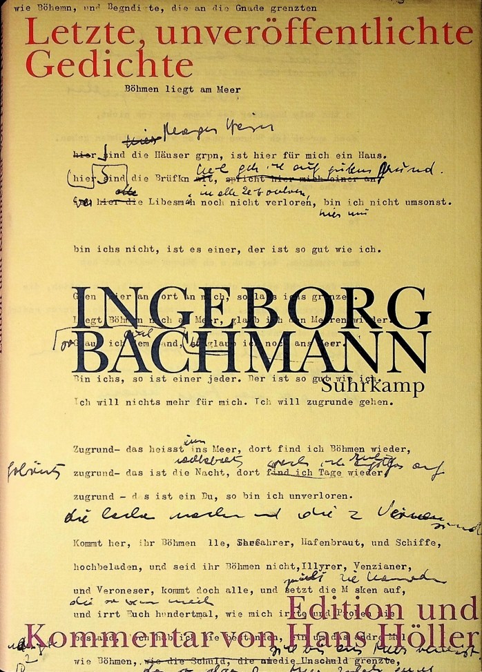 Aus: Ingeborg Bachmann, Letzte, unveröffentlichte Gedichte, Entwürfe und Fassungen. Edition u. Kommentar von Hans Höller. Freankfurt/Main: suhrkamp, 1998, S. 155 (letzte Textstufe)