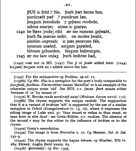 Thus have I spun my, lay with craft of word and wrought it wondrously, aged and nigh unto death by fault of this mouldering house; at times I mused upon it and sifted my thoughts in the dungeon of night. I knew not clearly of that rood aright, ere wisdom in ample power imparted wider counsel in the thought of my heart… I was stained by my deeds of evil, shackled in sin, harried by sorrow, bound with bitterness, compassed about by trouble ere that in majesty the King of might granted me knowledge to console old age, ere that He meted out to me His radiant grace, instilled it in my heart, revealed its glory, made it more ample, loosed my body, undid the bolts of my breast and taught me song−craft, which in the world I have used with will and gladness.