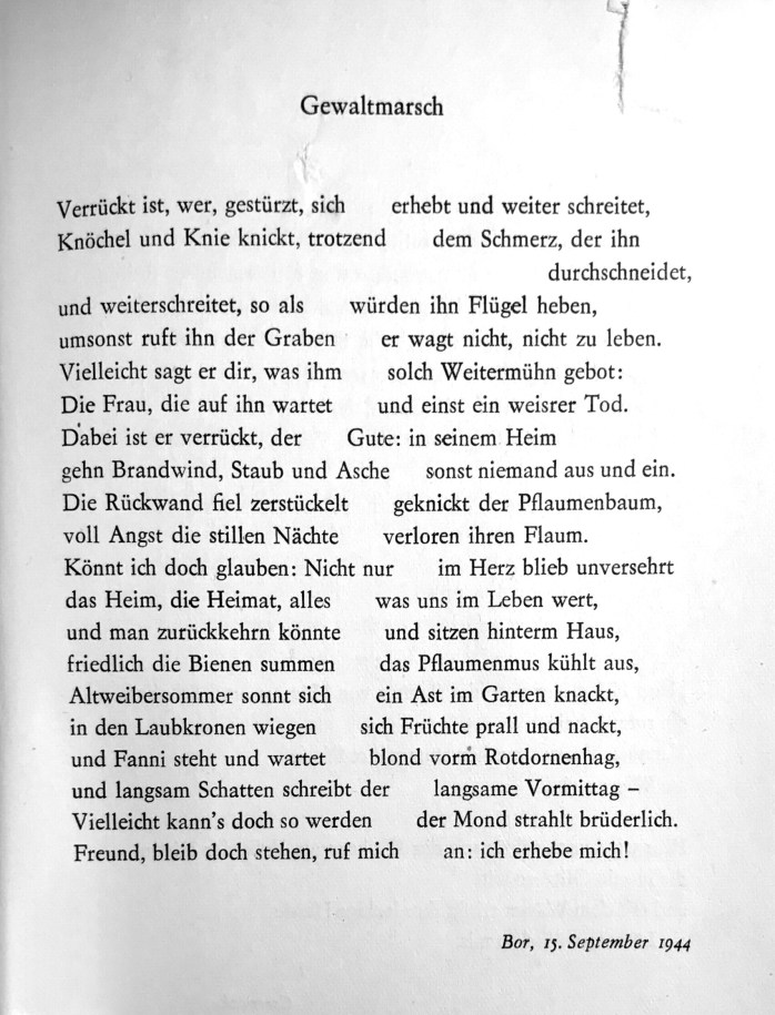 You're crazy. You fall down, stand up and walk again, your ankles and your knees move but you start again as if you had wings. The ditch calls you, but it's no use you're afraid to stay, and if someone asks why, maybe you turn around and say that a woman and a sane death a better death wait for you. But you're crazy. For a long time only the burned wind spins above the houses at home, Walls lie on their backs, plum trees are broken and the angry night is thick with fear. Oh if I could believe that everything valuble is not only inside me now that there's still home to go back to. If only there were! And just as before bees drone peacefully on the cool veranda, plum preserves turn cold and over sleepy gardens quietly, the end of summer bathes in the sun. Among the leaves the fruit swing naked and in front of the rust-brown hedge blond Fanny waits for me, the morning writes slow shadows--- All this could happen The moon is so round today! Don't walk past me, friend. Yell, and I'll stand up again!