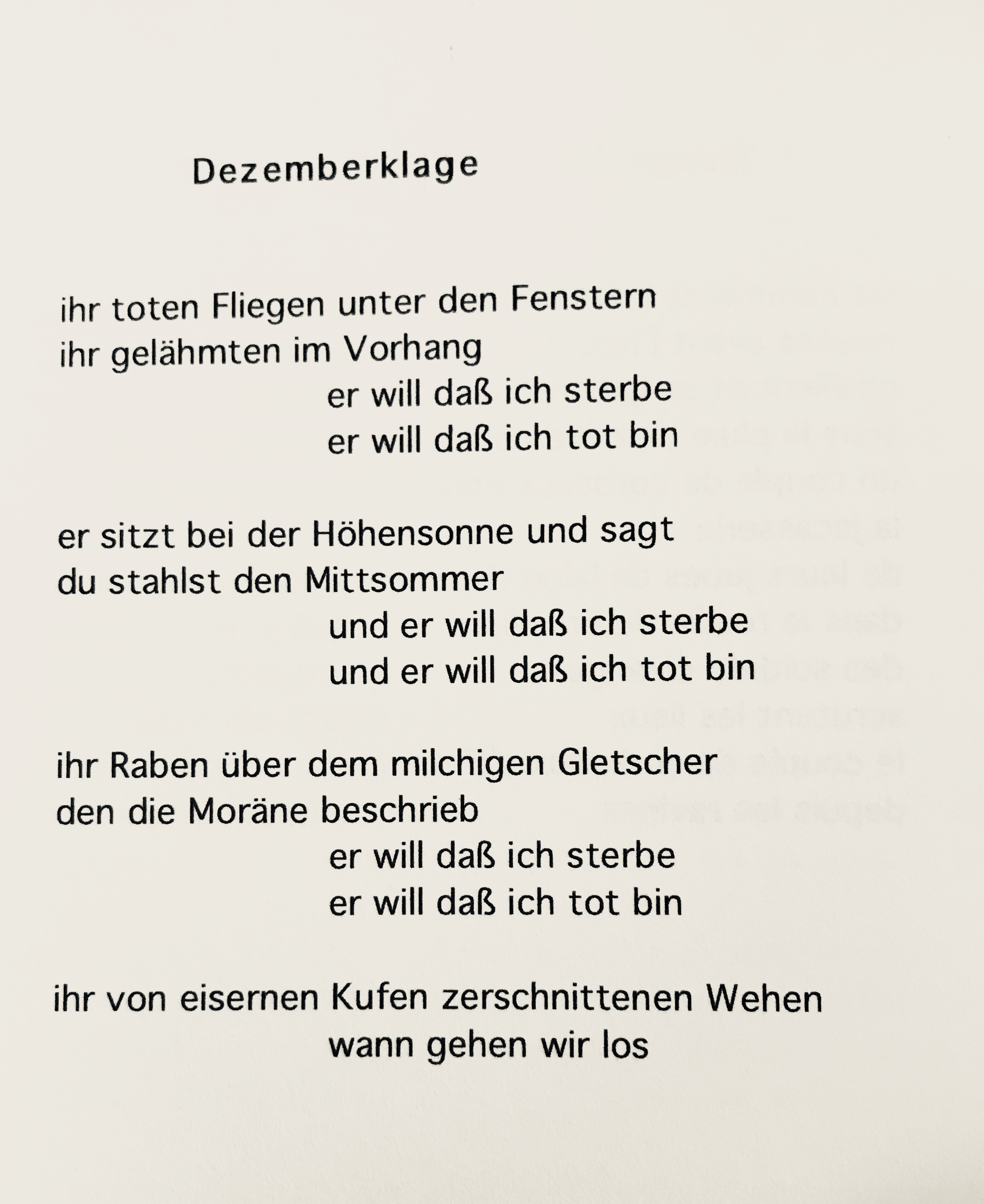 Und den Schluß würde ich so übersetzen: „Weil ihr noch zuhört, weil es in Zeiten wie diesen, / damit ihr überhaupt zuhört, notwendig ist, / ein Gespräch über Bäume zu führen.“ Und in der zweiten Strophe: „das ist kein russisches Gedicht, es ist nicht irgendwo sondern hier“.