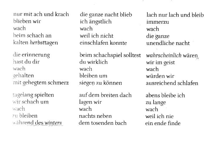 Aus: Grenzfallgedichte Eine deutsche Anthologie. Herausgegeben von Anna Chiarloni und Helga Pankoke. Berlin und Weimar: Aufbau, 1991, S. 118