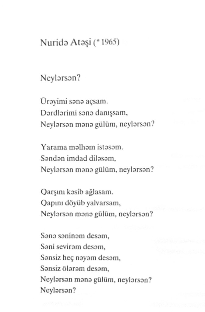 Aus: Falter & Flamme. Ein Jahrtausend aserbaidschanische Liebeslyrik. [Zweisprachig] Übertragen von Nourida Ateschi & Jan Weinert. Berlin: Matthes & Seitz, 2008, S. 169