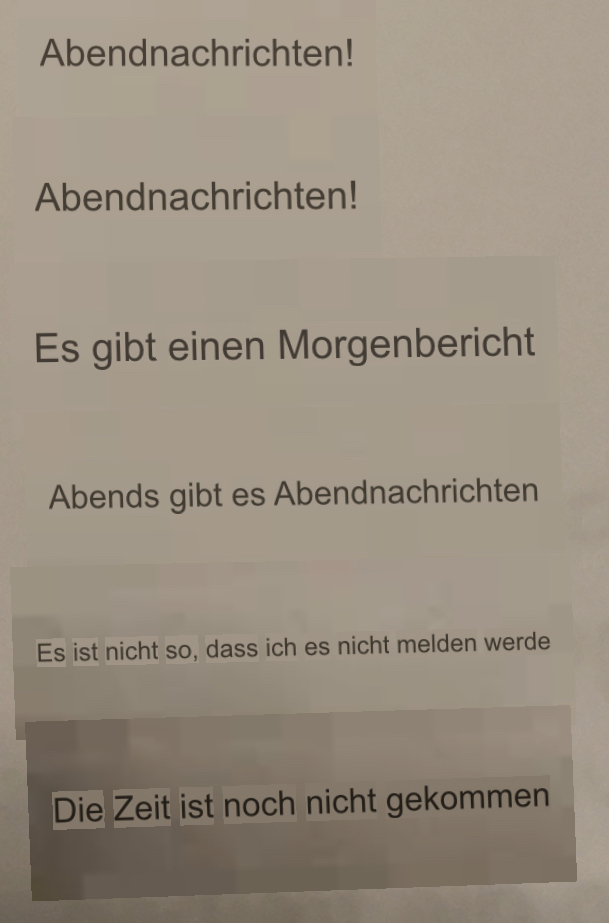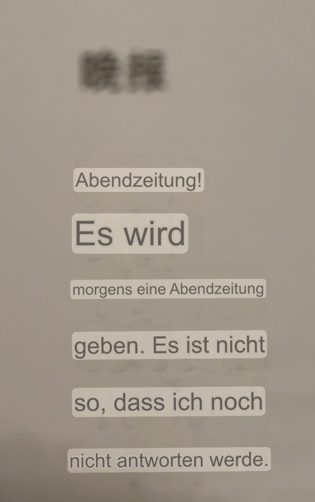 Da die KI nicht ein für allemal fertige Übersetzungen liefert, kann man abweichende Fassungen erhaschen – es lohnt sich, es mehrmals zu versuchen und auch mal schnell Zwischenergebnisse aufzuschnappen. Hier zwei dieser Fassungen.