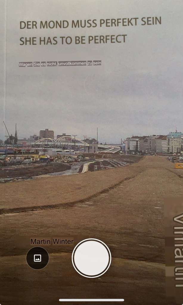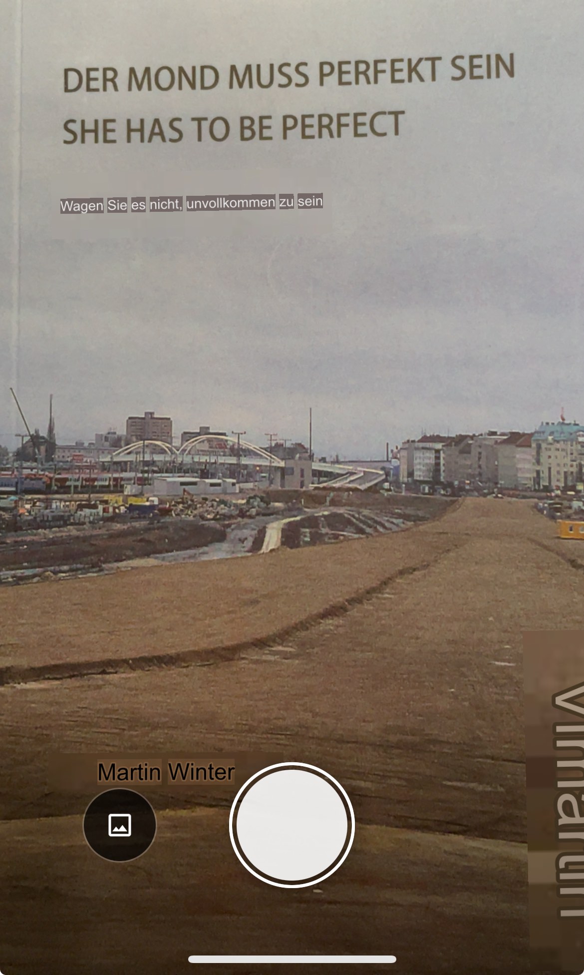 Aus: Martin Winter: Der Mond muss perfekt sein. She has to be perfect. [Wagen Sie es nicht, unvollkommen zu sein] (Googleübersetzung des chinesischen Titels). Mit 27 Übersetzungen von Yi Sha. Wien: fabrik.transit, 2016, S. 67