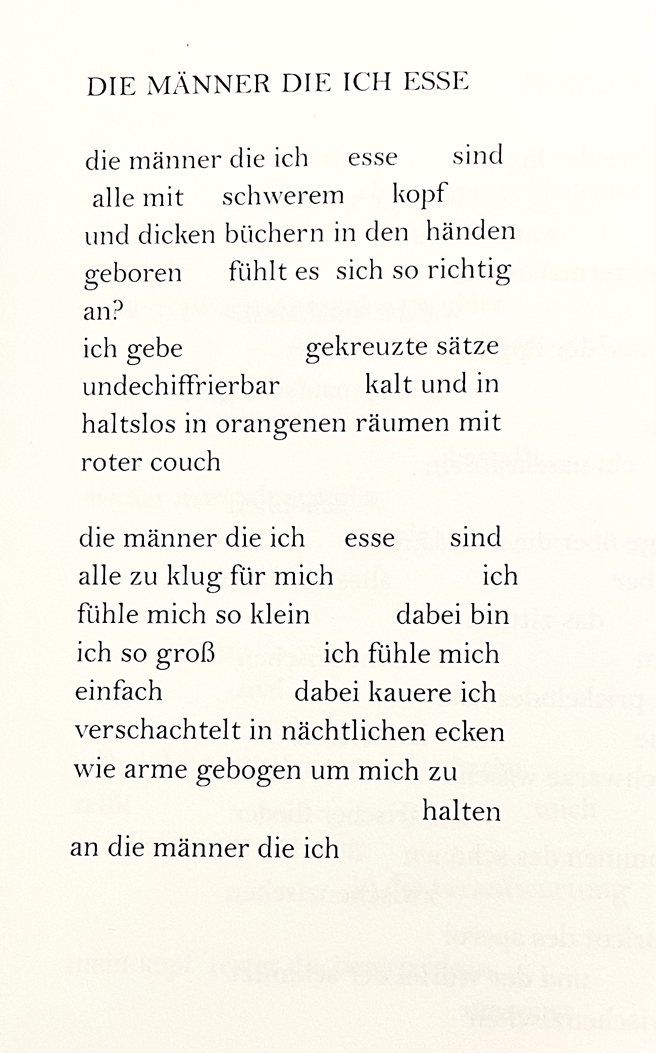 Aus: Es gibt eine andere Welt. Eine Anthologie aus Sachsen. Neue Gedichte. Herausgegeben von Andreas Altmann und Axel Helbig. Leipzig: poetenladen, 2011, S. 123