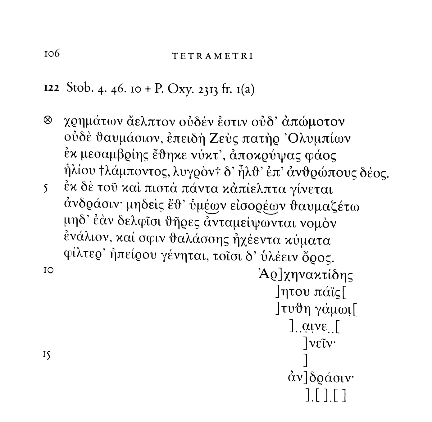 Archilochos 122 W = 74 D. Stob. 4.46.10 + P. Oxy. 2313 fr. 1 (a). Aus: Archilochos: Gedichte. Hrsg. u. übersetzt von Günter Nickel (Tusculum). Düsseldorf, Zürich: Artemis & Winkler, 2003, S. 107 (= Günter Nickel 2003). Der griechische Text ebd. S. 106.