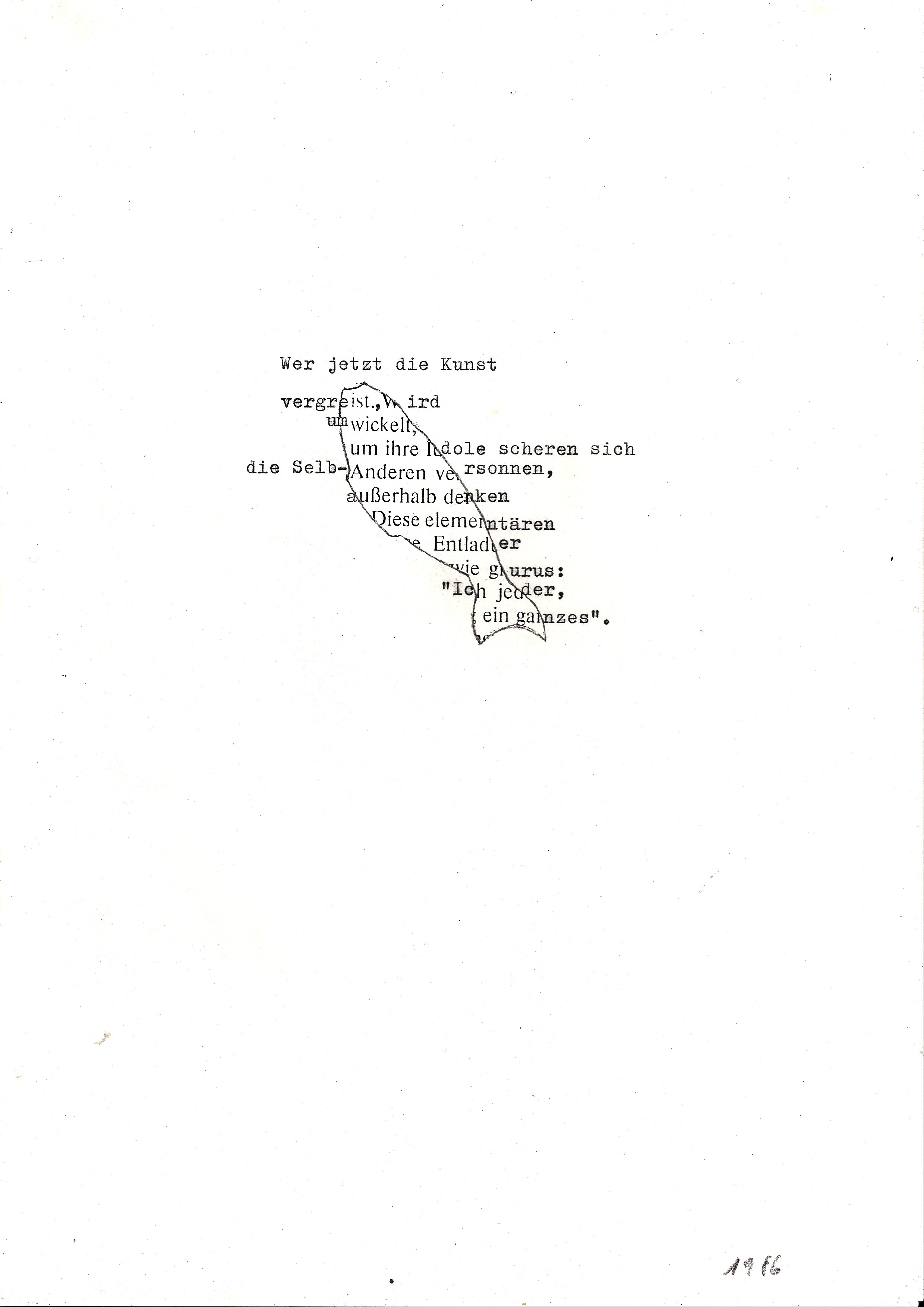Fragmenttexte sind eine Spezialität der Autorin und Künstlerin Angelika Janz seit vielen Jahren. Sie entstehen in der Regel aus einem aus Fremdtext herausgeschnittenen Fragment, meist ein schmalerer oder breiterer Kasten, aber eben auch eine Figur wie hier der Fisch. Dieser wird aufgeklebt und um ihn herum mit Stempel, Schreibmaschine oder Stift zu einem neuen Text ergänzt.